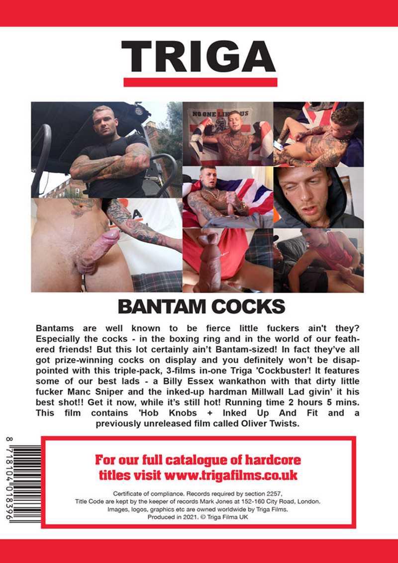 Bantams are well known to be fierce little fuckers ain't they? Especially the cocks - in the boxing ring and in the world of our feathered friends! But this lot certainly ain't Bantam-sized! In fact they've all got prize-winning cocks on display and you definitely won't be disappointed with this triple-pack, 3-films in-one Triga 'Cockbuster! It features some of our best lads - a Billy Essex wankathon with that dirty little fucker Manc Sniper and the inked-up hardman Millwall Lad givin' it his best shot!! Get it now, while it's still hot! Running time 2 hours 5 mins. This film contains 'Hob Knobs + Inked Up And Fit and a previously unreleased on download film called Oliver Twists.