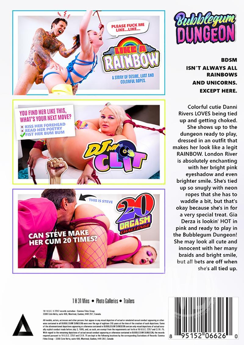 Colorful cutie Danni Rivers LOVES being tied up and getting choked. She shows up to the dungeon ready to play, dressed in an outfit that makes her look like a legit RAINBOW. London River is absolutely enchanting with her bright pink eyeshadow and even brighter smile. She's tied up so sungly with neon ropes that she has to waddle a bit, but that's okay because she's in for a very special treat. Gia Derza is lookin' HOT in pink and ready to play in the Bubblegum Dungeon! She may look all cute and innocent with her many braids and bright smile, but all bets are off when she's all tied up.