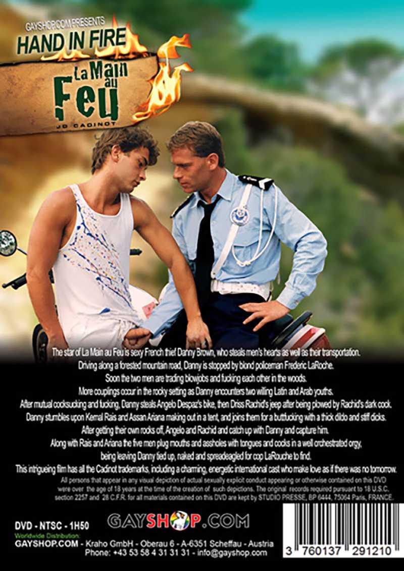 The star of La Main au Feu is sexy French thief Danny Brown, who steals men's hearts as well as their transportation. Driving along a forested mountain road, Danny is stopped by blond policeman Frederic LaRoche. Soon the two men are trading blowjobs and fucking each other in the woods. More couplings occur in the rocky setting as Danny encounters two willing Latin and Arab youths. After mutual cocksucking and fucking, Danny steals Angelo Despaz's bike, then Driss Rachid's jeep after being plowed by Rachid's dark cock. Danny stumbles upon Kemal Rais and Assan Ariana making out in a tent, and joins them for a buttfucking with a thick dildo and stiff dicks. After getting their own rocks off, Angelo and Rachid and catch up with Danny and capture him. Along with Rais and Ariana the five men plug mouths and assholes with tongues and cocks in a well orchestrated orgy, being leaving Danny tied up, naked and spreadeagled for cop LaRouche to find. This intrigueing film has all the Cadinot trademarks, including a charming, energetic international cast who make love as if there was no tomorrow.