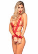 Leg Avenue Cage Strap Crotchless Lace Teddy with G-String Back and Open Cup, Tie Back Straps and Restraint Wrist Cuffs - Red - Medium/Small - 2 Pieces/Set