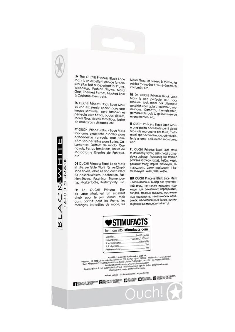 OUCH! Presentb s a series of 4 handmade, high quality, lightweight and easy to wear masks, detailed with intricate modern Venetian inspired designs. Created with laser-cutting technology from the finest, eco-friendly materials, these masks will really give you an air of seductive mystery! Two quality ribbons will secure the mask in place for long hours of comfortable wear or play and facilitate easy adjustment. The OUCH! Princess Black Lace Mask is an excellent choice for sensual play but also perfect for Proms, Weddings, Fashion Shows, Mardi Gras, Themed Parties, Masked Balls & Costume events etc.