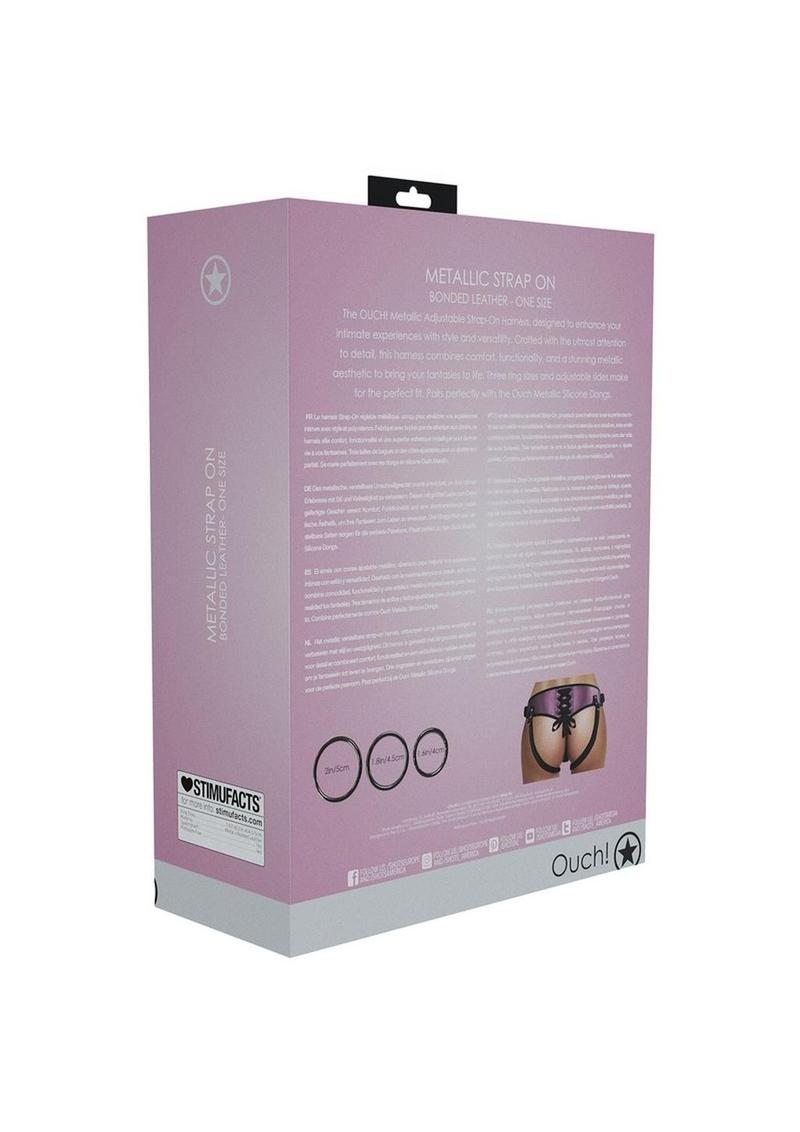 The OUCH! Metallic Adjustable Strap-On Harness, designed to enhance your intimate experiences with style and versatility. Crafted with the utmost attention to detail, this harness combines comfort, functionality, and a stunning metallic aesthetic to bring your fantasies to life. Three ring sizes and adjustable sides make for the perfect fit. Pairs perfectly with the Ouch Metallic Silicone Dongs.