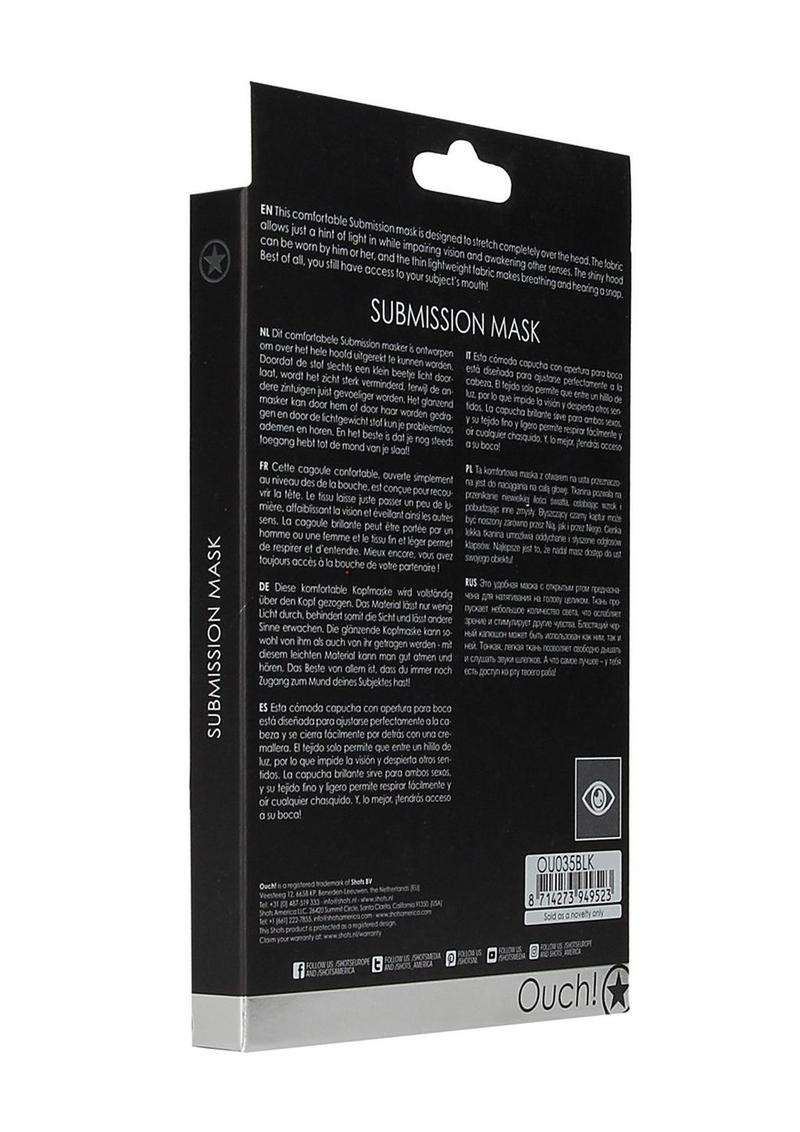 This comfortable Submission mask is designed to stretch completely over the head and closes easily at the back with a zipper. The fabric allows just a hint of light in while impairing vision and awakening other senses. The shiny hood can be worn by him or her, and the thin lightweight fabric makes breathing and hearing a snap. Best of all, you still have access to your subject's mouth!