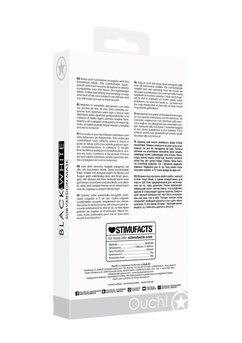 Keep your submissive incognito with this Subversion Mask. This comfortable open-mouth and eyes hood is designed to stretch completely over the head. The lightweight fabric makes breathing and hearing a snap and best of all, your subject can still see and you still have access to their mouth!