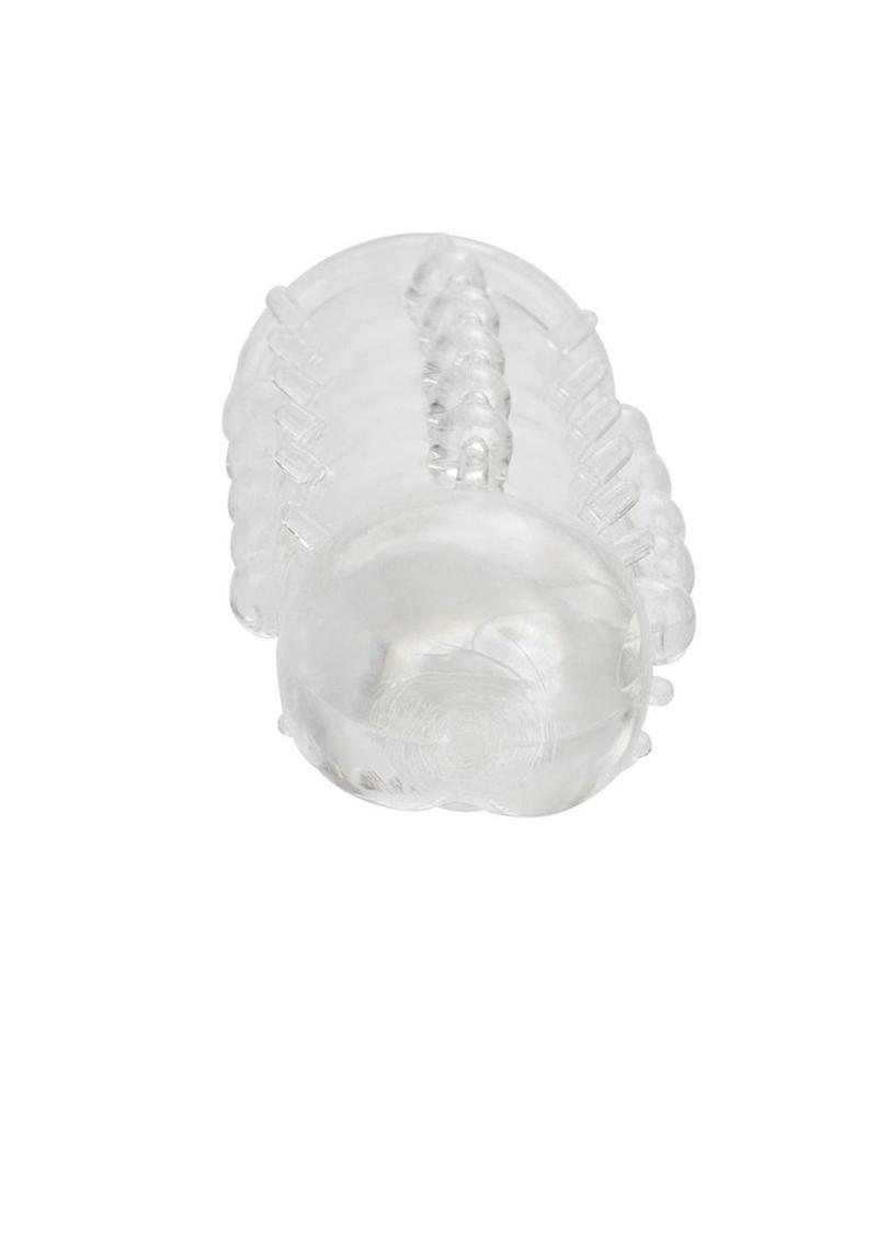 Soft, textured and stretchy penis extender adds girth plus 1b / 2.54 cm in length. Support ring secures fit.