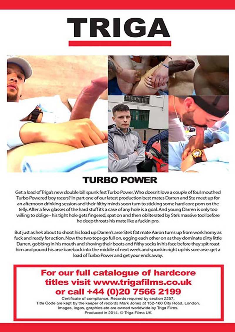 Get a load of Triga's new double bill spunk fest Turbo Power. Who doesn't love a couple of foul mouthed Turbo Powered boy racers? In part one of our latest production best mates Darren and Ste meet up for an afternoon drinking session and their filthy minds soon turn to sticking some hard core porn on the telly. After a few glasses of the hard stuff it's a case of any hole is a goal!